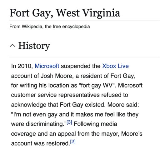https://www.gamesradar.com/microsoft-suspends-mans-account-because-he-lives-in-fort-gay-west-virginia/And yet MS doesn’t mind “The Ballad of Gay Tony” on the Xbox Live Marketplace… maybe it should ban Rockstar?
