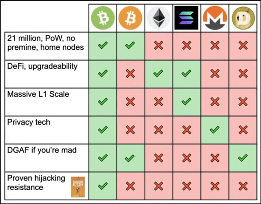 Massive L1 scale - That’s coming to Monero too, and anyway it’s not as urgent as ensuring real privacy and censorship resistance. It is hilarious that Solana has a check mark here, when it’s been down more times than I can count, not to mention the delays.