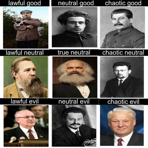 Someone else already pointed out the issues with D&D style alingnment. Even following D&D alignment, I would think Lenin’s and Stalin’s positions would be swapped. Most of Lenin’s time active as a revolutionary was overthrowing the tsar, which definitely went against the law. Much of Stalin’s time as a revolutionary was as general secretary of the new society the revolutionary workers and peasants built, so he was operating within the law. If this was limited to Stalin’s work before the founding of the USSR this would make more sense, but people on this chart come from a bunch of different times.