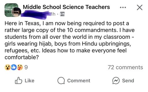 Something like having all of the different religious tenets put up would make perfect sense in a high school world history classroom. However, none of that has any business being a in a middle school science classroom.