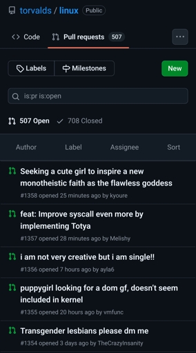 yogurtwrong@lemmy.world to Linux@lemmy.ml · 11 days agoLinux github repo is now a dating boardlemmy.mlimagemessage-square35linkfedilinkarrow-up1324arrow-down18