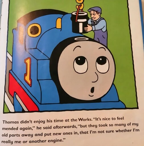 In a backroom the parts were assembled to be Tom the tank engine, a copy of Thomas in every physical aspect. No one expected Tom to think he was Thomas so no one knew how to fix him after he saw Thomas. Tom broke in a way which no new parts could fix.