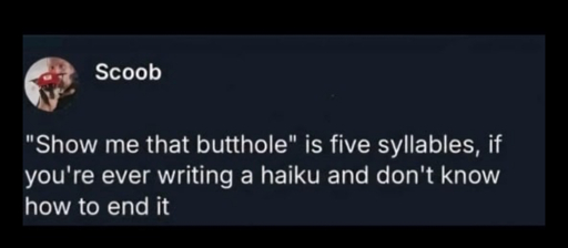 minus-squarezout@fedia.iolinkfedilinkarrow-up4·2 days agoWhere cripples can see, And the blind can walk again, Show me that butthole.
