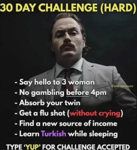 SSUPII@sopuli.xyz to Lemmy Shitpost@lemmy.world · 16 days agogrindset challengesopuli.xyzimagemessage-square33linkfedilinkarrow-up1257arrow-down17