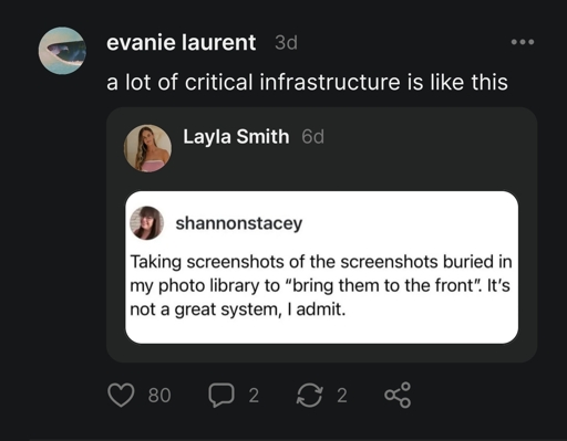 So the screenshot is a reminder because when you’re scrolling through recent photos you might happen to see it? Isn’t that kind of like setting an alarm clock that will only go off 50% of the time?