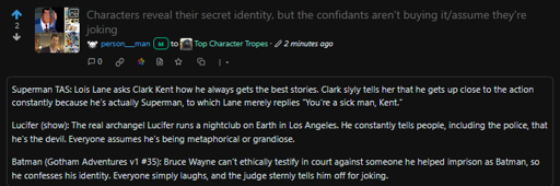 TopCharacterTropes is basically the only subreddit I enjoy browsing anymore; the discussions there have been refreshing and enjoyable since it started becoming a more popular community. I hope to see the community on Lemmy burgeon in a similar way.