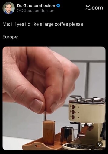 You think 8-12-16oz is the standard in coffee shops worldwide, because to you, “coffee” means “latte”, and “coffee shop” means “place that sells latte in plastic to-go cups”, whereas the standard unit of coffee in Europe is a café espresso, which is a 30ml shot of pure coffee served in a 50-100ml white china demitasse.