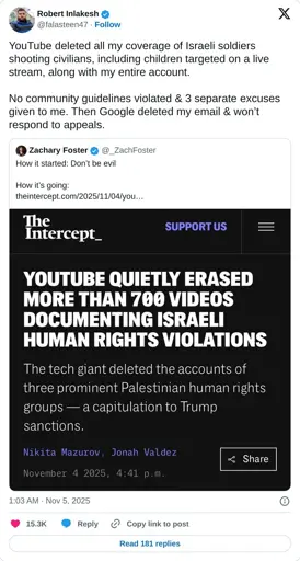 arrow-up11.07Karrow-down1imageYouTube deleting videos documenting Israeli human rights violationslemmy.blahaj.zoneInterstellar_1@lemmy.blahaj.zone to Microblog Memes@lemmy.worldEnglish · 7 days agomessage-square47linkfedilink