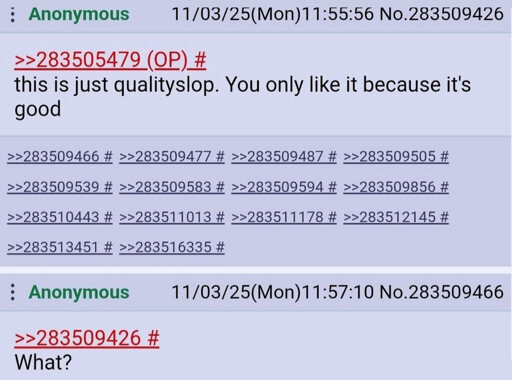 mudkip@lemdro.id to Greentext@sh.itjust.worksEnglish · 29 days agoThe word "slop" has been taken full circlefiles.catbox.moeimagemessage-square7linkfedilinkarrow-up1264arrow-down14