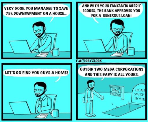 While you’re right that the first time home buyer incentive does make it easier to afford a house than a lot of people realize (I bought my first house in January 2020 with a $10k down payment, and was easily able to stay on top of mortgage payments with a $40k/year salary), this is a comic, and the real issues of high housing prices and property scarcity due to private corporation buyouts are being exaggerated for comedic effect.