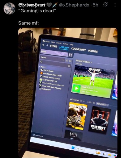 The Picard Maneuver@piefed.world to Gaming@lemmy.worldEnglish · 2 months ago"gaming is dead"media.piefed.worldimagemessage-square106linkfedilinkarrow-up1539arrow-down18