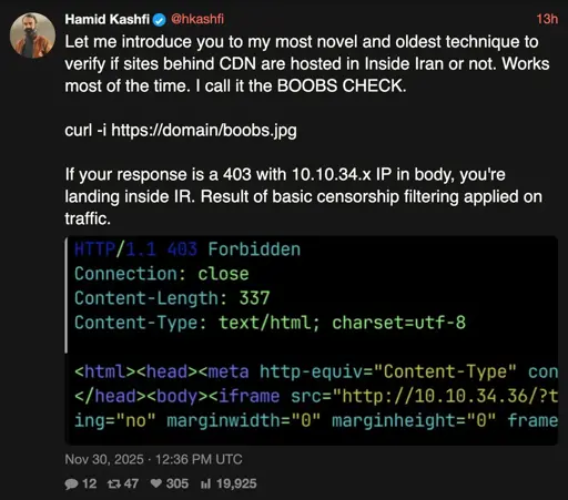 arrow-up1338arrow-down1image"Boobs check" verify if sites behind CDN are hosted in Inside Iran or notlemmus.orgSundray@lemmus.org to Mildly Interesting@lemmy.worldEnglish · 13 days agomessage-square34linkfedilinkfile-text