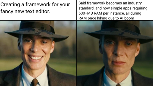 But it’s not like electron apps became an industry standard now that there is a memory shortage. I also don’t think there is an increase in electron apps now that there is a memory shortage. These things are not connected in the way the meme suggests. Is it more problematic since memory is more expensive? Sure, maybe for some people running old hardware that want to upgrade. Otherwise, a lot of people already have plenty of memory to run these apps.