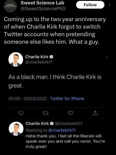 Im choosing to believe there was at least one person who took this at face value, as admission that charley Kirk was a ‘white passing’ black man, and was racist enough to decide he was never going to listen to another word CK said because of his race.