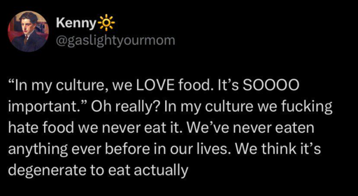 I didn’t even comment because I’m some kind of cooking or dining enthusiast. It was more about the general attitude (which I very much grew up with) essentially that it is silly and self-indulgent to stop and smell the roses when there’s money to be made or work to be done. Basically the conservative culture where being a good human means being a productive boot-licking worker bee and not getting into all that touchy-feely human stuff.